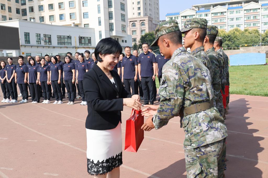 在慰问交流中,聂磊首先对全体承训教官和带队教师的辛勤付出表示衷心感谢,特别对武警甘肃省总队某部长期以来为学校军训工作给予的大力支持和专业指导予以高度评价。她强调,军训是贯彻落实全民国防教育的重要实践,是大学新生迈入校园的“第一课”,更是传承红色基因、厚植爱国情怀、锤炼意志品质的重要载体,对新生成长成才具有不可替代的意义。她希望承训官兵继续发扬人民军队听党指挥、能打胜仗、作风优良的光荣传统,坚持科学组训、严格要求、耐心指导,以过硬的军事素质和良好的军人风范为新生树立榜样;同时,要求带队教师切实履行职责,密切关注新生思想动态与训练状态,做好服务保障工作,与教官协同配合,共同确保军训任务圆满完成。