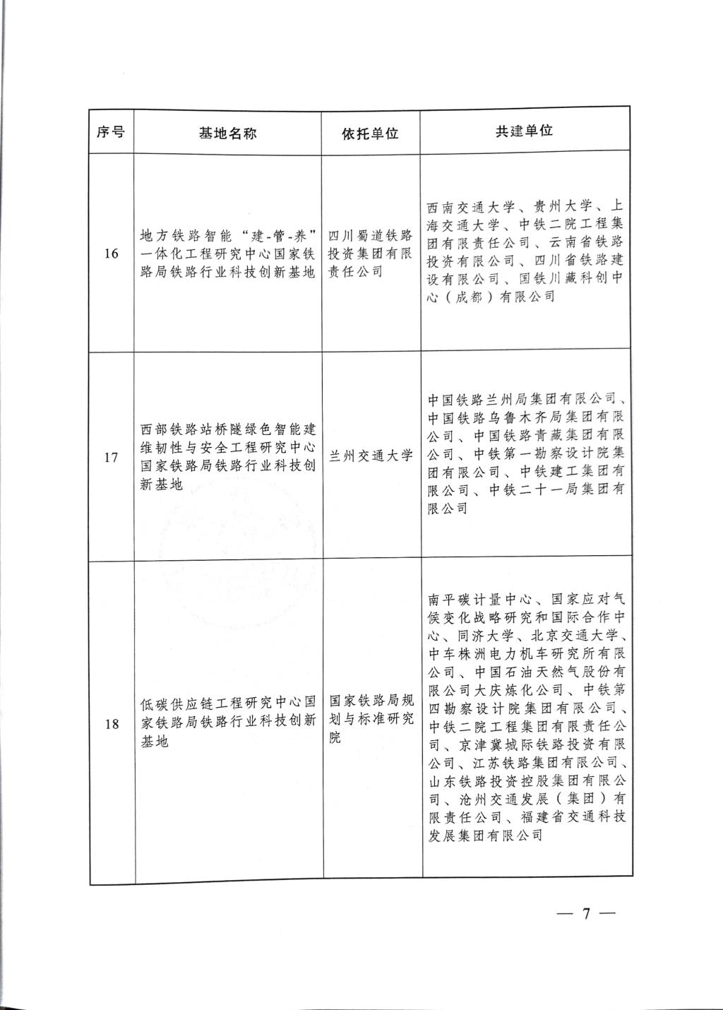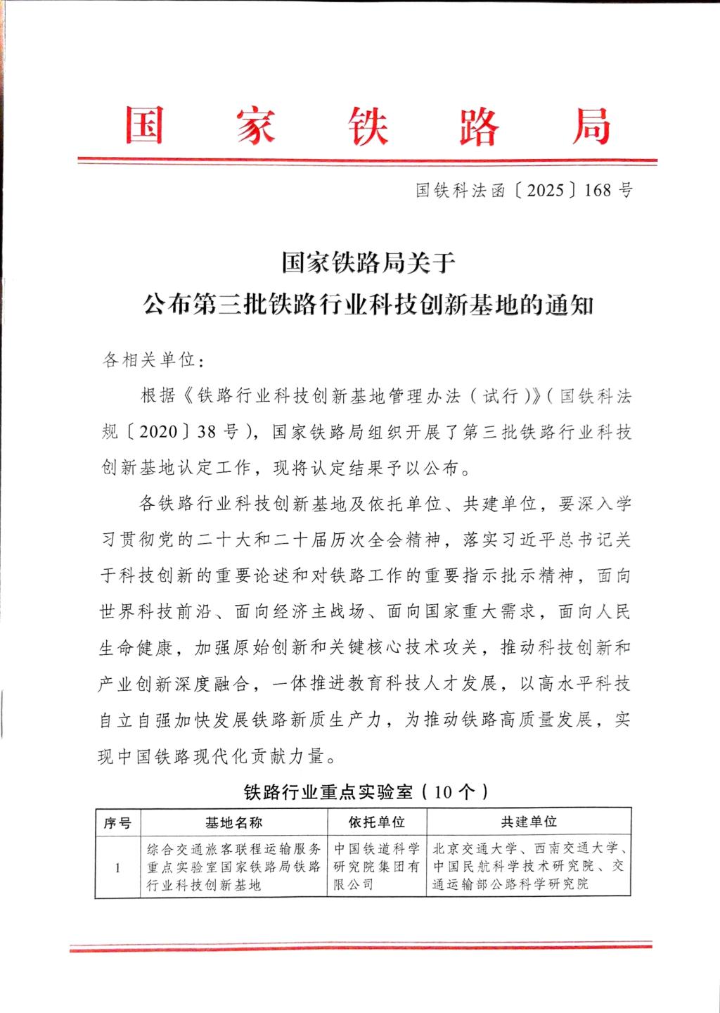 12月19日,国家铁路局发布《关于公布第三批铁路行业科技创新基地的通知》(国铁科法函〔2025〕168号)。兰州交通大学作为依托单位,由我校狄生奎教授牵头申报的“西部铁路站桥隧绿色智能建维韧性与安全工程研究中心”成功获批,成为本批次全国铁路行业工程研究中心申报中唯一由高校牵头成功获批的行业科技创新基地,这也是我校首次获批铁路行业工程研究中心(学校作为依托单位已获批2个铁路行业重点实验室),实现了我校在该类别科技创新基地建设上的历史性突破。