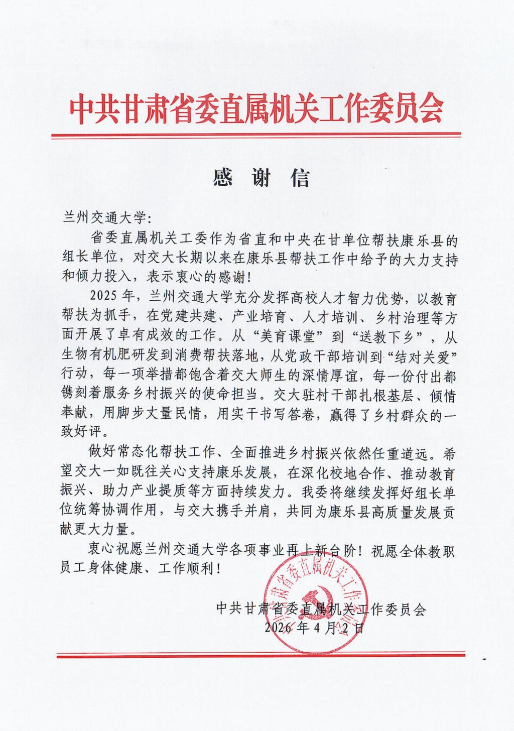 省委直属机关工作委员会向兰州交通大学发来感谢信
