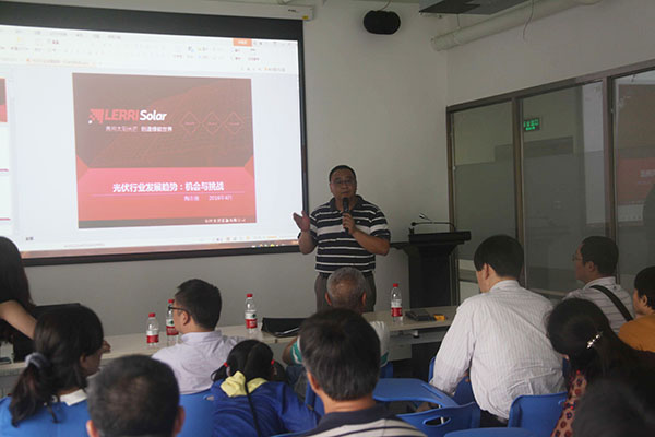 兰州大学校友、隆基股份全资子公司广东乐业清洁能源陶志强总经理分享的主题为《光伏行业发展趋势:机会与挑战》,主要介绍了光伏发展的历程和现状、光伏产品、光伏电站及应用、政策解读和商业机会和问题等;我校校友、中国能源建设集团广东省电力设计研究院周昊总工程师分享的主题为《风电漫谈》,主要围绕风电美景、风力发电的过程、风电开发的环境、风电行业的产业链和风电的投资机会等内容展开。活动吸引了两校校友30多人参加。