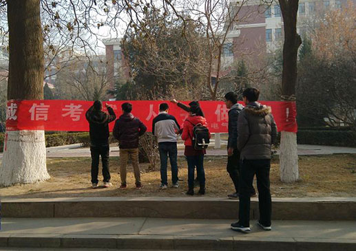 2015年12月31日,学院所有班主任专门抽出时间组织本班学生召开诚信考试主题班会,强调考试纪律及考试要求,力求让诚信考试的意识植根于学生心中。同时,电气工程第五学生党支部的全体党员和入党积极分子也在朝阳餐厅门口自发组织了“诚信考试,从我做起”的主题签名活动。他们还号召路过的同学也在“诚信考试,从我做起”的横幅上签名,承诺自己将认真复习,遵守考场纪律,诚信考试。