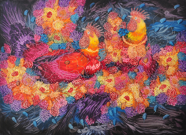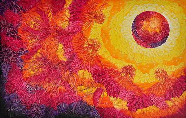 此次展览,是我校艺术设计学院的蓝充老师继7月在北京锦都艺术中心举办“花花世界——蓝充艺术展”以来的本年度第二次个人展览,共展出自2012年以来创作的40余幅油画作品。蓝充老师的作品充满了色彩艳丽的线条,缠而不乱,繁而有序,结构分明层次丰富,契合传统美学的整体审美特性和激情描绘的理性思考;符号化的描绘和场景传递着艺术家对人生的思考——爱和包容、矛盾与平衡、扩散与收敛、激情与理性、探索与逻辑。