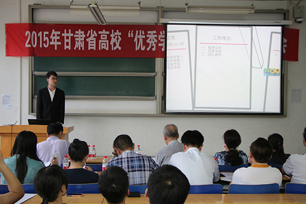 6月28日下午,学校举行2015年甘肃省高校“优秀学生干部”候选人答辩会,学生处相关负责人、部分学院(部)辅导员、班主任、学生代表100余人到场观摩。