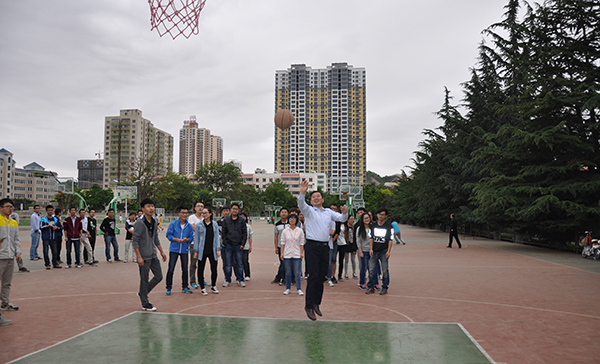期间,党建武副校长与学院领导班子就学院的现状、发展进行了研讨。在参加班级活动前,他对学生强调,良好的身体素质是一切的基础,体育运动有助于同学们的身心健康,希望同学们能加强锻炼,以一种积极的心态面对每天的生活和学习。在趣味投篮活动中,党建武副校长积极与学生开展互动,比赛现场气氛热烈,欢呼声和掌声此起彼伏。