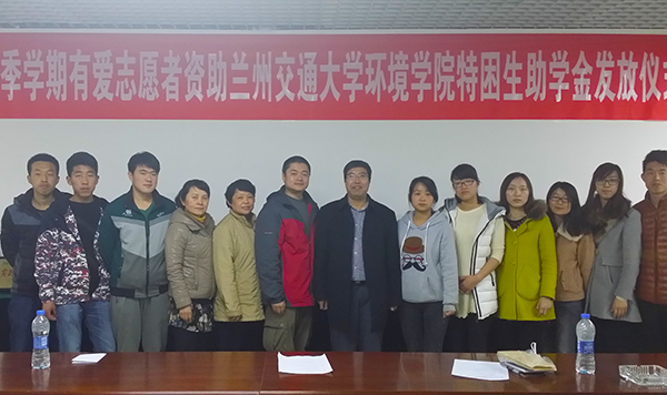 3月12日,2015年春季学期有爱志愿者资助兰州交通大学环境学院特困生助学金发放仪式举行。有爱志愿者代表耿龙、高翼、朱晶,环境学院主管学生工作的院领导、学工办全体老师及受资助学生参加了发放仪式。
