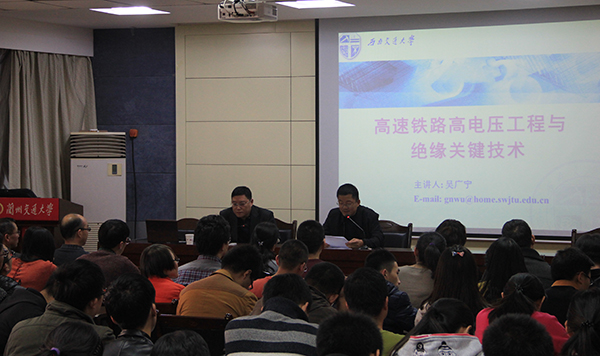 吴广宁教授在自动化学院会议室作了题为《高速铁路高电压工程与绝缘关键技术》的学术报告。吴广宁教授对牵引供电设备状态监测与安全评估、高压绝缘的设计与优化、防雷与接地技术三个研究方向做了介绍,重点介绍了牵引供电设备状态检测、供电系统运行稳定性评估、绝缘子运行特性及优化、电磁模拟与数值仿真技术、新型电介质材料开发与应用、电介质材料绝缘性能测试新技术、高速铁路防雷与接地技术、复杂地质条件下变电站接地技术、电磁干扰等方面最新研究成果及进展。