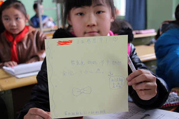 为了让孩子们更好的了解感恩节,志愿者向孩子们普及了感恩节的由来,感恩节的庆祝形式,感恩小故事。小学生们也积极发言,气氛非常活跃。到了动手的时刻,志愿者教孩子们用心折出代表感谢的爱心,并在“爱心”上写下对父母想说的话。颗颗爱心是们对父母爱的表达,句句话语是对父母心的感恩。