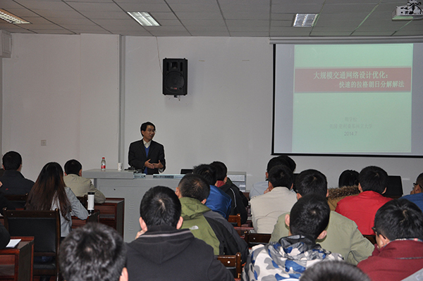 周学松教授作了“大规模交通网络优化设计”学术报告。他从如何提高交通网络服务水平开始,通过时空棱柱的建模技术,分析了基于时间预算及活动参与的网络可达性概念,构建了交通网络设计的0-1规划模型;根据大规模网络模型求解的难题,设计了基于拉格朗日松弛技术的求解算法。周学松教授的学术报告内容丰富、深入浅出、生动翔实,赢得了师生们的一致赞誉。