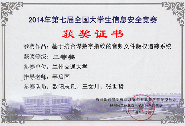 7月21日,第七届全国大学生信息安全竞赛在海军工程大学落幕,我校2011级计算机专业欧阳志凡、王文川、张世哲同学组成的团队作品“基于抗合谋数字指纹的音频文件版权追踪系统”(指导教师李启南)获得二等奖,取得了本届赛事省内参赛高校所获的最好成绩。