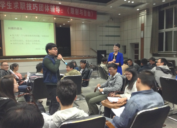 公开课打破传统的授课模式,凌翔老师以报数方式随机将序号相同的6名学生分为一组,每组围成正方形而坐,以便讨论。在讨论环节,每位同学都提出了自己在就业方面最大的疑问,本组成员讨论过后,再由公选出的组长作为代表统一提问,凌翔老师现场解答,问题涉及范围广泛,少数民族生活习俗与就业环境的选择等问题都得到了解答。讨论环节在轻松愉快的氛围下有条不紊地展开,每位同学都乐在其中并得到满意的答案。
