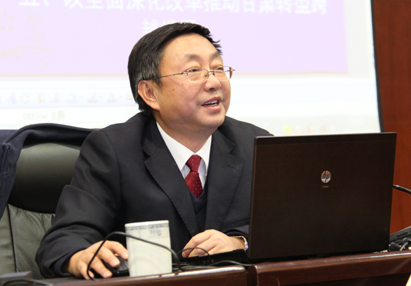 王福生院长以《全面深化改革的行动纲领和行动指南》为题,从清醒认识全面深化改革的背景、深刻把握全面深化改革重大意义、准确理解全面深化改革的指导思想以及总体思路和基本原则、全面深化改革的主要任务和重大举措、以全面深化改革推动甘肃转型跨越发展五个方面,对十八届三中全会作了全面解读。报告中,王福生院长结合工作实践,运用生动鲜活的实例,从国际到国内,从沿海到西部;从“老三大”差别到“新三大”差距;从市场持续不规范不统一到部门、行业条款分割,从市场配置的“基础性”作用发挥到“决定性”作用转变;从“做蛋糕”到“分蛋糕”关系的处理;从负面清单到简政放权,深刻阐述了全面深化改革的重要作用和重大意义。