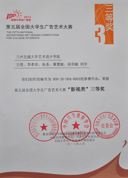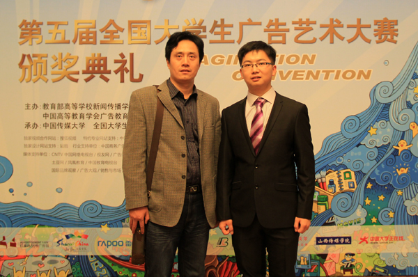 11月30日,第五届全国大学生广告艺术大赛颁奖典礼在北京全国政协礼堂举行,共有来自全国高校的800余名师生参加了颁奖典礼。我校艺术设计学院王煜同学作为甘肃赛区唯一的等级奖(三等奖)获得者与指导老师郑向阳共同参加了颁奖典礼。