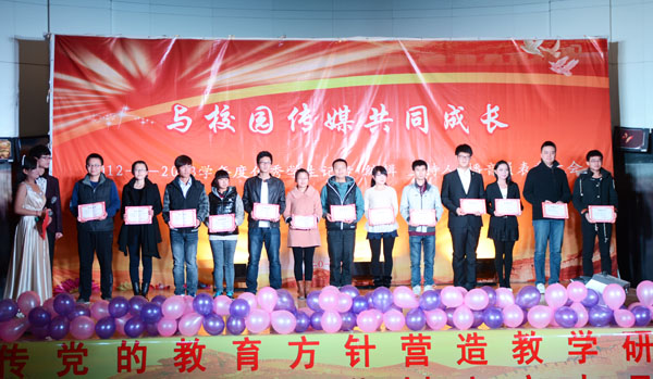 11月22日晚,我校党委宣传部组织召开了以“与校园媒体共同成长”为主题的2012—2013学年度优秀播音员、学生记者、学生编辑、主持人表彰大会,对过去一年来在学校校报、广播站、电视台协助老师开展各项工作的60名优秀学生进行了表彰奖励。
