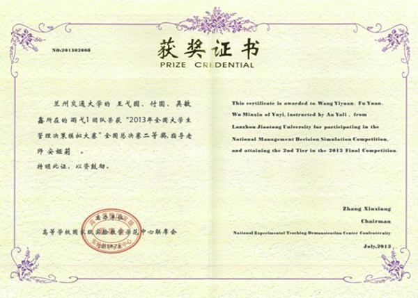 近日,由教育部高等学校国家级实验教学示范中心联席会经济与管理学科组主办、深圳大学承办的2013年全国大学生管理决策模拟大赛总决赛暨全国经济管理实验教学研讨会落幕。在我校教务处以及经管学院的精心组织下,我校组建的“雨弋1”代表队经与来自全国各高校88支队伍七轮的激烈角逐,荣获二等奖。