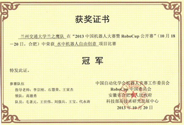 2013年中国机器人大赛暨RoBoCup公开赛10月18日至20日在安徽合肥举行,我校选派代表队参赛,共获得全国一等奖6项,其中冠军2项、亚军2项、季军2项(具体见