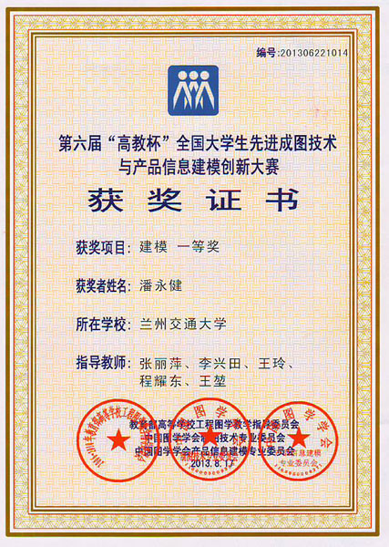 经过暑期培训和刻苦练习,在比赛中,我校土木1001班潘永健同学获得建筑类建模一等奖,土木1101班张兵同学获得建筑类建模二等奖;工设1002班梁宏星、车辆1101班时珂同学获得机械类建模二等奖。