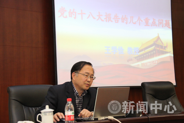 王学俭教授从深刻理解召开背景、充分认识召开意义、全面把握报告内容、深入学习报告精神四个方面进行了精彩演讲。他指出,全面建成小康社会、党的发展战略机遇期是我们深刻理解十八大报告的背景。党的十八大的召开,就是应对国际国内大势,准确判断重要战略机遇期内涵和条件的变化,全面把握机遇,沉着应对挑战,赢得主动,赢得优势,赢得未来,确保到二〇二〇年实现全面建成小康社会宏伟目标。当今世界正处在大发展大变革大调整时期,世界多极化、经济全球化深入发展,科学技术日新月异,各种思想文化交流交融交锋更加频繁,国内改革发展稳定任务繁重,我们必须紧紧抓住和用好我国发展的重要战略机遇期,战胜一系列严峻挑战,奋力把中国特色社会主义事业推进到一个新的发展阶段。