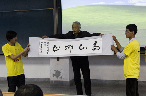 讲座结束时,我校校友工作协会的同学们为杨期翔校友献花,并赠送了由在校学生书写的书法作品“高山仰止”,表达了在校学生对老校友、老学长的崇敬和仰慕之情。