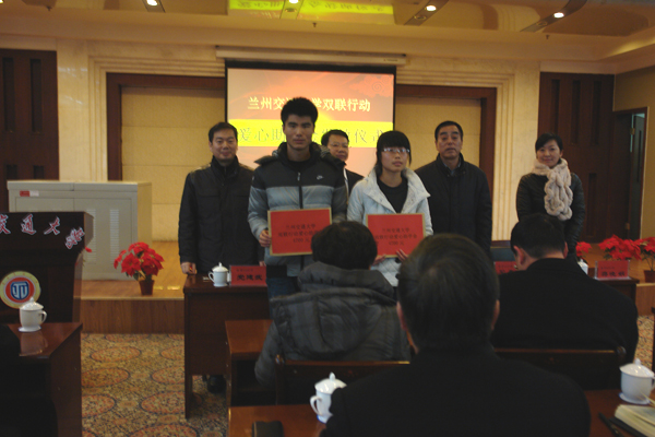 2012年12月28日,我校举行“双联”行动爱心助学金发放仪式,来自康乐县鸣鹿乡、现就读于我校土木学院工程管理专业的2012级学生雷世虎以及来自和政县城关镇、现为我校机电学院热能与动力工程专业的张芯茹两名同学分别获得该助学金资助。