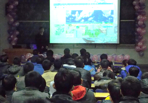 决赛现场,选手们通过ppt向评委展示了自己的作品,并回答了有关问题。其中第九组选手历时四个月完成的我校三维校园电子地图,涵盖了整个交大校园,对不熟悉交大校园环境的人们具有很好的指引作用。本次大赛共有十二组作品获奖,其中一等奖2项,二等奖4项,三等奖6项。
