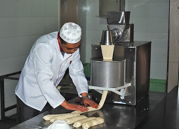 一袋25公斤的面,和好之后放进“挤子王”(面棒机)里,大约10分钟后,一个个拉面的剂子便已成形,而传统的手工和面、做面剂子却要近30分钟。这个代替人工劳动、全国首个牛肉拉面机器引起了众多牛肉面店老板的关注和兴趣。