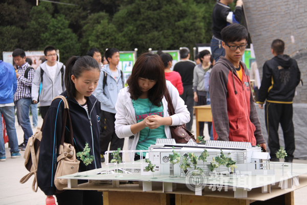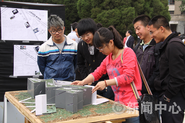 5月4日上午,建筑学院学生作业作品展在图书馆前开展,20余个小型展览馆模型以及其它建筑设计作品吸引了广大师生驻足观看。