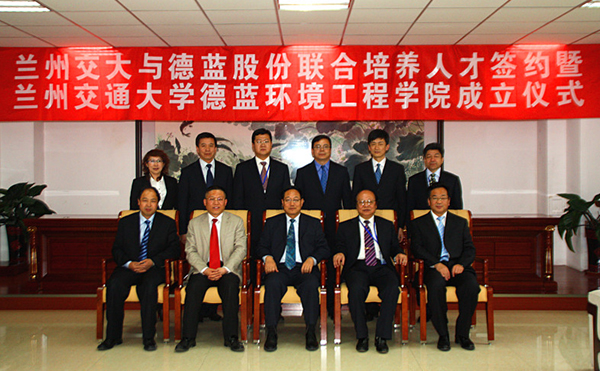 在热烈的掌声中,任恩恩校长与曾凡付董事长签订了联合培养协议,并为“兰州交通大学德蓝环境学院”揭牌。