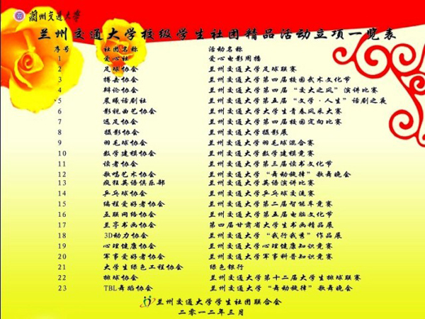 本次社团文化艺术节由校团委主办,校学生社团联合会承办,各学生社团协办。活动以 “交大之风”演讲比赛、甘肃省大学生书画精品展、智能车竞赛等23个校级精品社团活动为主要载体,为广大同学提高人文修养、拓宽知识视野、提升创新能力等方面提供广阔的平台。