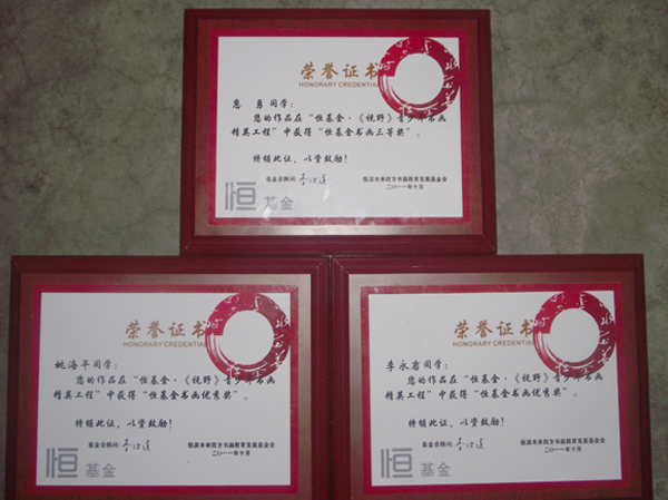 首届“恒基金《视野》杂志青少年书画奖励工程”作品已经在《视野》杂志刊登。这次展示的作品涵盖了书法及篆刻等文字艺术,充分展示了当前青少年书法爱好者及书法教育工作者的良好水准。获奖选手分别获得2000元至10000元的奖金,且分别获得甘肃省书法家协会副主席王岳川教授、甘肃省书法院院长马国俊教授、甘肃省书法家协会副主席秦理斌等书画名家的书画作品一副,同时颁发诺贝尔奖得主李政道先生签名的获奖证书。