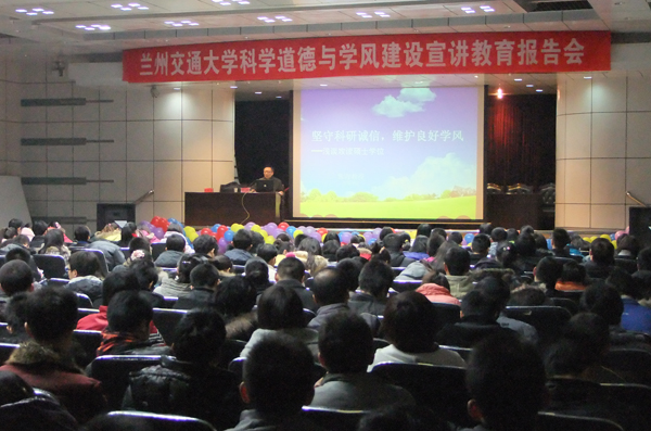 12月22日下午,五教萃英厅座无虚席。由我校研究生学院主办的兰州交通大学科学道德和学风建设宣讲教育报告会在这里隆重举行。我校环境学院博士生导师常青教授、研究生学院副院长杨军为全校2011级研究生新生做了专题宣讲报告。