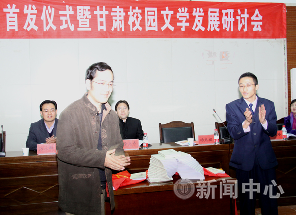 杨光祖教授与甘肃省大学生文学联盟主席、我校土木学院08级学生崔亚军共同为《甘肃校园文学》首发式揭彩。与会人员围绕《甘肃校园文学》一书,分别就甘肃校园文学的现状、发展潜力等进行了研讨,并对甘肃校园文学的发展进行了展望。