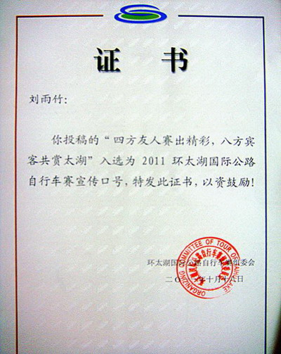 我校刘雨竹同学撰稿的口号“四方友人赛出精彩,八方宾客共赏太湖”儒雅大气、信息明确,既突出了自行车公路赛的赛事核心,又明确了举办地的美景“太湖”,同时“四方友人、八方宾客”表达了赛事的“国际性”及“友谊第一”的体育精神,将用于赛事期间各种场合的宣传。