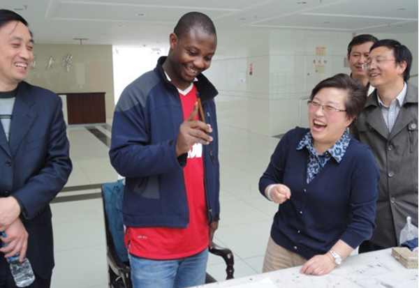 参加交流活动的同学们也都跃跃欲试,上台提笔展示风采,我校留学生也饶有兴趣的尝试着书写汉字,朱晨霞女士与留学生展开互动,用毛笔书写了英文。文学院院长王为群教授也提笔挥毫,与朱晨霞老师进行了切磋。