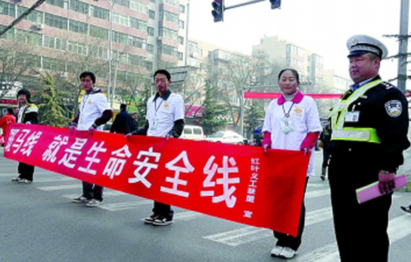 3月12日,由我校自动化学院青年志愿者协会、兰州红叶义工、安宁区交警大队联合开展的以“尊重斑马线就是尊重生命”为主题的首届兰州市爱心斑马线活动在安宁区费家营十字路口启动。