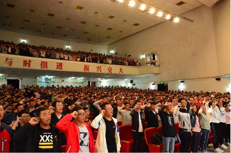 典礼在庄严的国歌声中拉开序幕,学生会主席张宇钦、研究生会主席唐径瑶和新生代表慕旭阳带领全体新生佩戴校徽并宣誓:“身为交大土木一员,我庄严宣誓:铭记‘尚德励志 博学笃行’之交大校训,传承‘逢山开路 遇水架桥’之土木精神,文明敬业 求实创新;饮水思源 爱国奉献;为实现中华民族伟大复兴的中国梦而努力奋斗!”