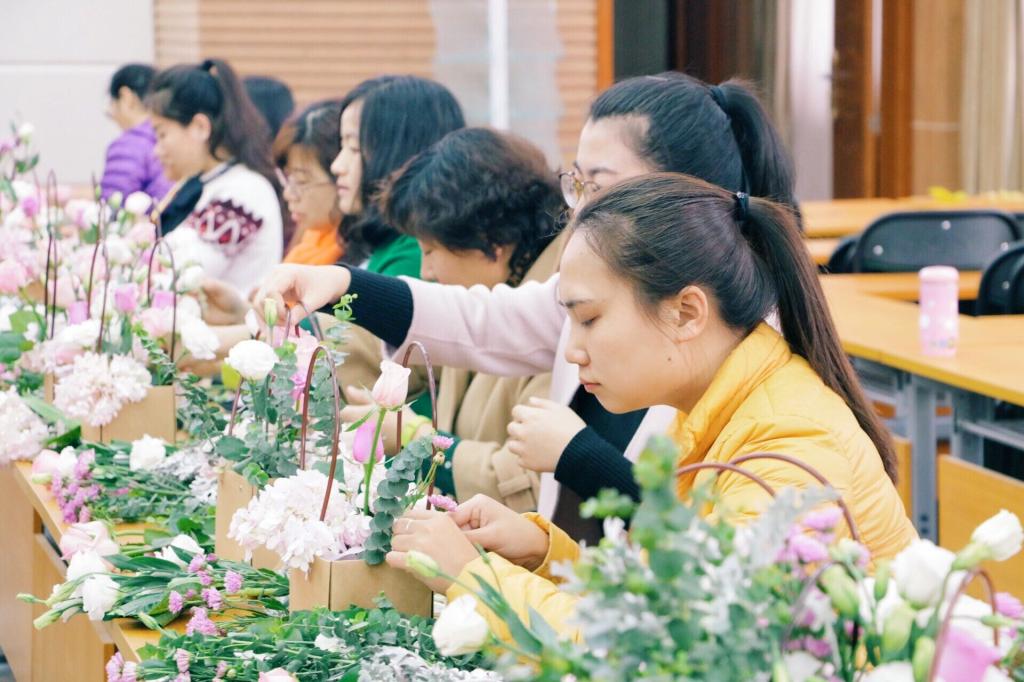 女职工们边听边学,精心构思,享受着亲自创作的乐趣和花艺的魅力。株态轻盈潇洒,花色清新淡雅的洋桔梗;形态灿烂高雅,象征爱情的荔枝玫;姿态美丽优雅,象征团圆美满的绣球花;清新秀丽,唯美浪漫的小雏菊......绚丽的鲜花在她们的匠心巧思中打造出了各具特色的精彩作品。