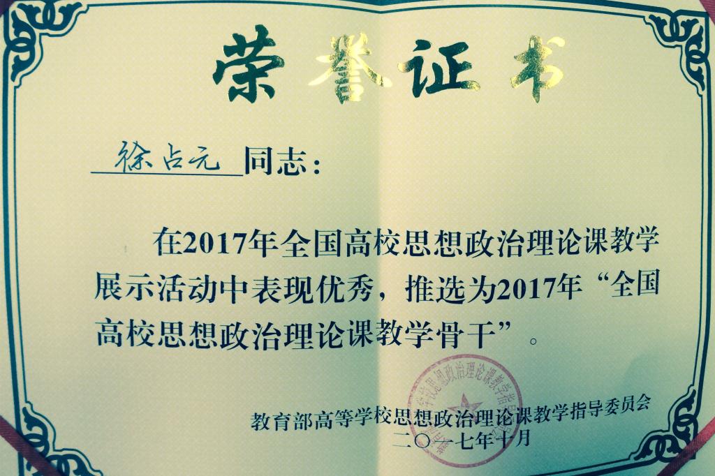 10月29日,2017年全国高校“毛泽东思想和中国特色社会主义理论体系概论”课现场教学展示和理论研讨会在天津工业大学举行。我校马克思主义学院徐占元副教授在讲课比赛中表现优异,荣获2017年“全国高校思想政治理论课教学骨干”荣誉称号。