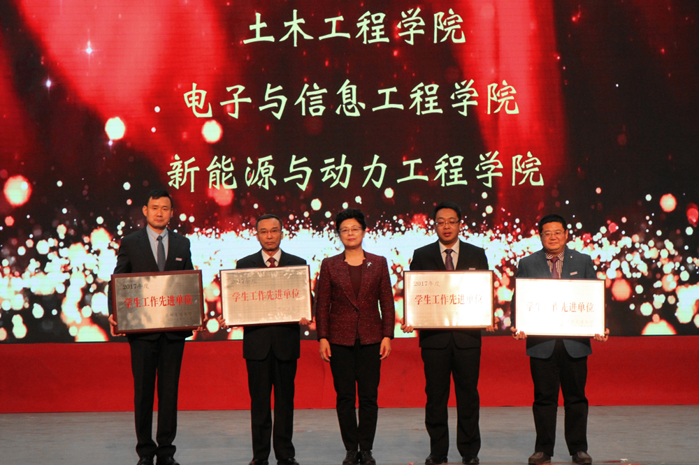 自动化与电气工程学院、土木工程学院、电子与信息工程学院、新能源与动力工程学院荣获2017年度“学生工作先进单位”称号,赵洁等10名同志荣获“优秀辅导员”称号,于本田等30名同志荣获“优秀班主任”称号,杜靓等10名同志荣获“学生管理工作先进个人”称号,李国卉等10名同志荣获“宿舍管理工作先进个人”称号,马燕等14名同志荣获“就业工作先进个人”称号,丁洁等10名同志荣获“共青团工作先进个人”称号。兰晓伟等10名同学荣获“榜样个人”称号,学校第四届研究生支教团荣获“榜样团体”称号。池瑶佳等45名同学荣获“交大之星奖学金”,曾思奥等50名同学荣获“中天科技奖学金”,陈文芳等100名同学荣获“天翼奖学金”,姚家辉等30名同学荣获“华成奖学金”。苏丹籍博士留学生马芙蓉荣获教育部“2017年度中国政府优秀来华留学生奖学金”,安德烈等15名国际学生荣获“优秀国际学生”称号。