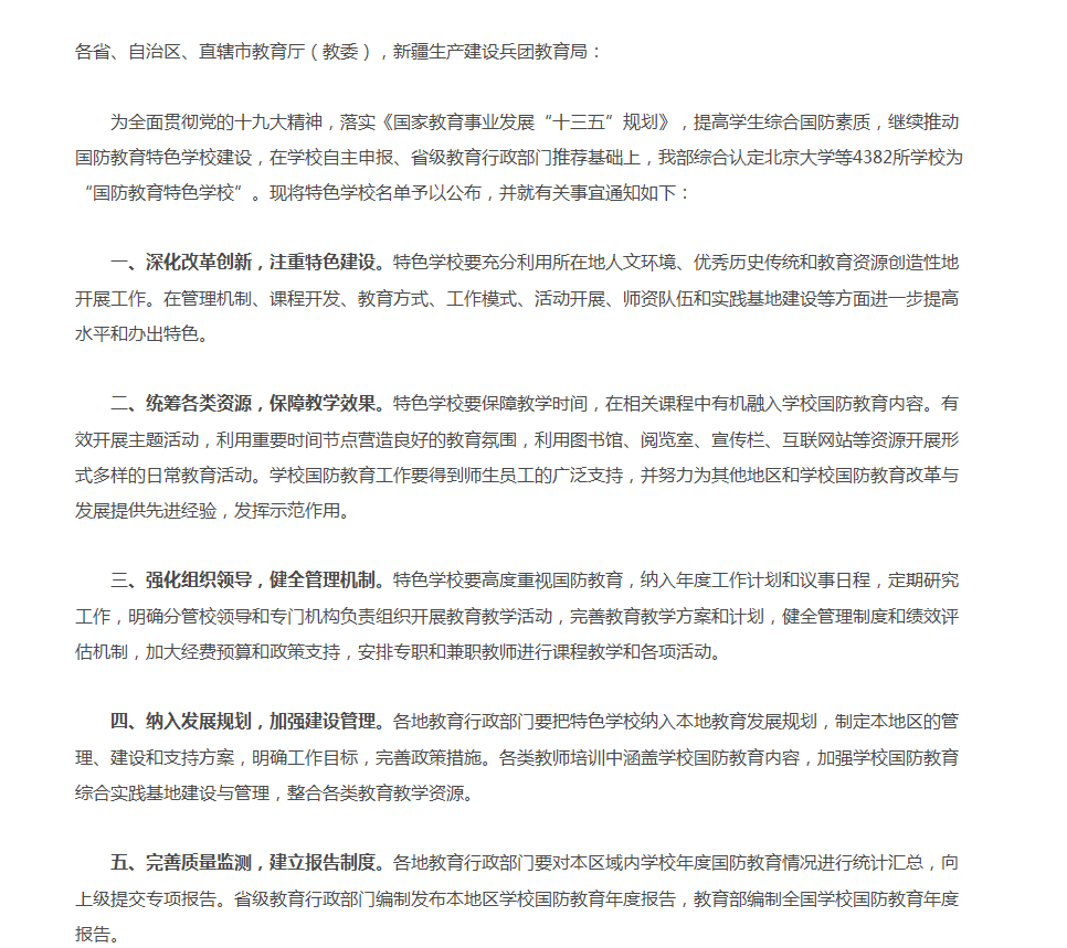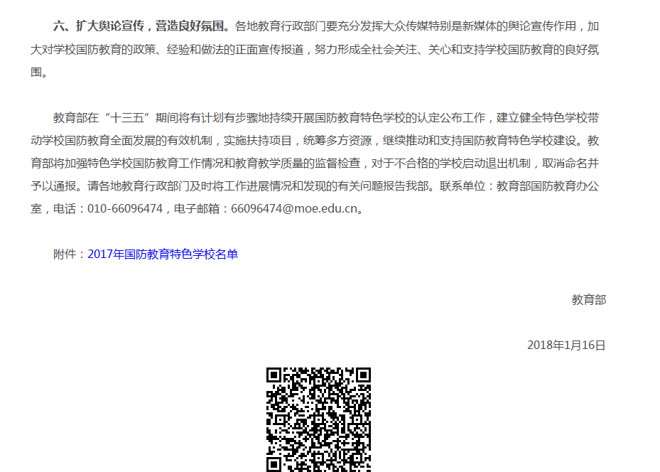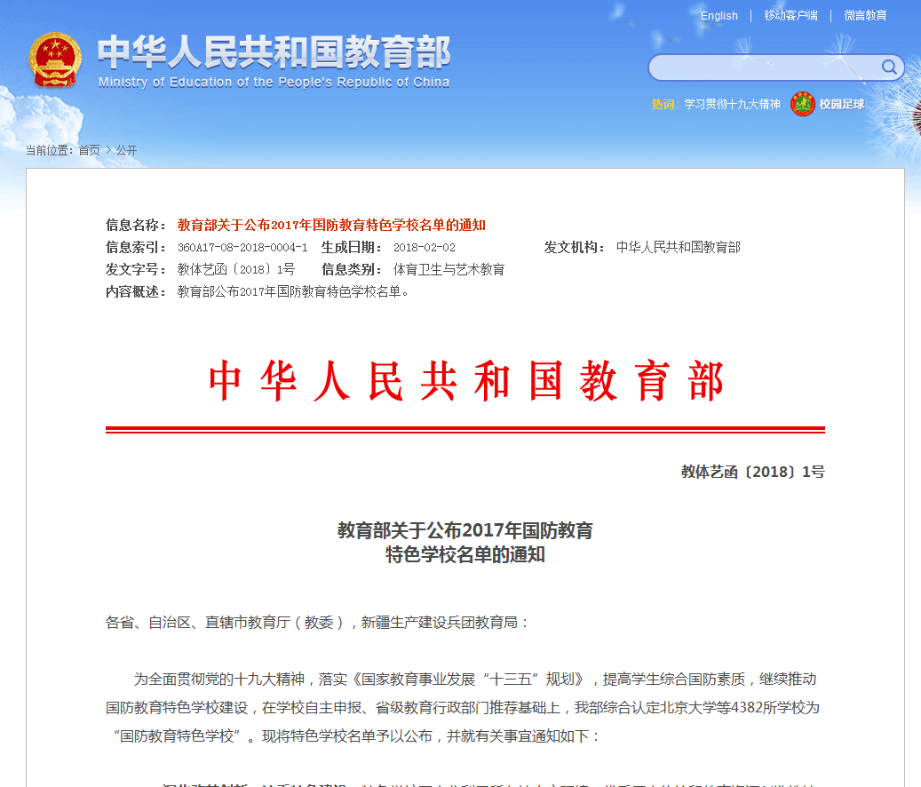 近日,教育部发文公布了2017年国防教育特色学校评选结果,我校荣获教育部“国防教育特色学校”称号。