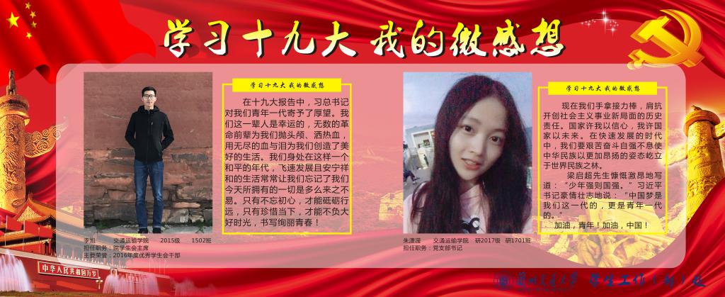 “广大青年要坚定理想信念,志存高远,脚踏实地,勇做时代的弄潮儿”。这是习近平总书记在十九大报告中对广大青年的殷切希望。这条寄语在我校学生中产生了强烈的反响,同时也在全校学生中掀起了学习党的十九大的热潮。土木学院学生会主席张宇钦同学在学习中表示,我们正处于一个伟大的变革时代,青年人应该将个人理想与国家发展结合起来,为中华民族的伟大复兴,为实现中国梦贡献自己的力量,以良好精神面貌和优异表现积极响应党的十九大的会议精神,为母校60年华诞增光添彩。交通运输学院研究生党支部书记朱潇滢在学习中表示,今天我们手拿接力棒,肩抗开创社会主义事业新局面的历史责任。国家许我以信心,我许国家以未来,在快速发展的时代中,我们要艰苦奋斗自强不息,使中华民族以更加昂扬的姿态屹立于世界民族之林。