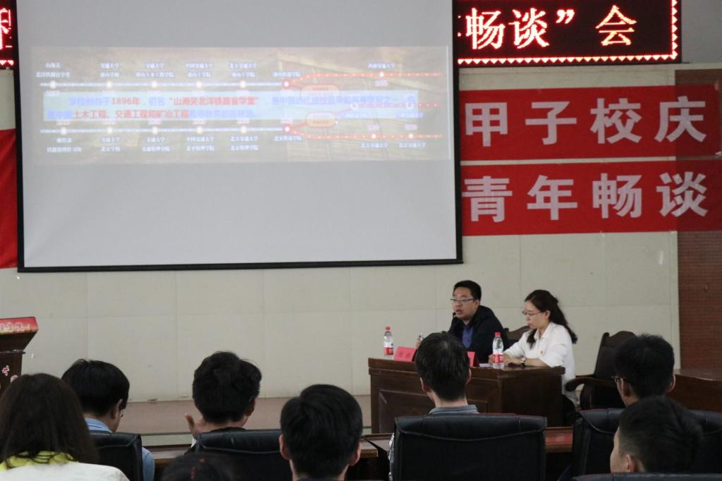 畅谈会在雄浑嘹亮的中国共产主义青年团团歌中开启,受邀嘉宾周涛老师首先为同学们做了“交大使命与青年担当”的主题讲座,追溯了交大历史,介绍学校发展历程,从122年前的山海关北洋铁路官学堂到1958年成建制迁兰建校,一辈辈铁院人将“以学报国”作为历史使命,为国家培养工程人才,投身祖国一线建设。周涛老师用栩栩生动的交大故事,鼓励同学们要勇于承接交大使命,体现“爱国荣校”的青年担当。