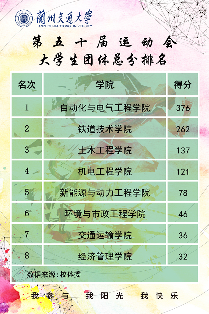 5月18日下午,随着大学生10*200米混合扛旗接力和大学生拔河比赛的结束,历时三天的兰州交通大学第五十届校运会圆满落下了帷幕。