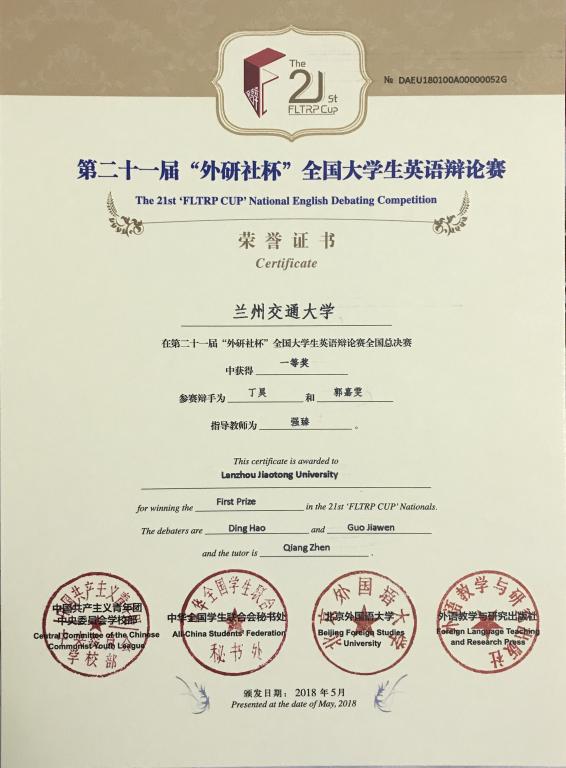 5月22日, 2018年第21届“外研社杯”全国大学生英语辩论赛全国总决赛在北京外国语大学圆满落幕。来自全国东、西、南、北四大赛区的109支队伍,在六天的时间里展开了精彩角逐。经过8轮循环赛,由我校外国语学院强臻老师指导、外国语学院学生郭嘉雯及电信学院学生丁昊组成的兰州交通大学代表队表现优异,荣获全国大学生英语辩论赛全国总决赛一等奖。这也是我省高校在此项赛事中获得的历史最好成绩。