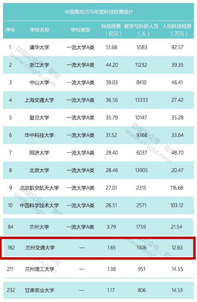 5月22日,教育部科学技术司正式发布了《2017年高等学校科技统计资料汇编》。汇编数据详细记录了 2016 年全国1804所设有理、工、农、医类教学专业的高等学校及其附属医院在基础研究、应用研究、试验发展以及 R&D 成果应用、其他科技服务等各个层面开展研究的总体状况,内容涉及科技人力、科技经费、科技机构、科技项目和开展国际科技交流等情况,以及与此相关的高等学校科技活动产出情况。从2016年中国高校科技经费的统计结果来看,共有256所高校年度科技经费超过1亿元。兰州交通大学以1.65亿元排名全国第182位,位居甘肃高校第二。