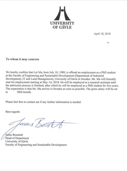 在导师闫浩文教授的鼓励与悉心教导下,经过坚持不懈的努力,在2018年5月被瑞典耶夫勒大学工程与可持续发展学院地理空间信息科学博士专业录取。