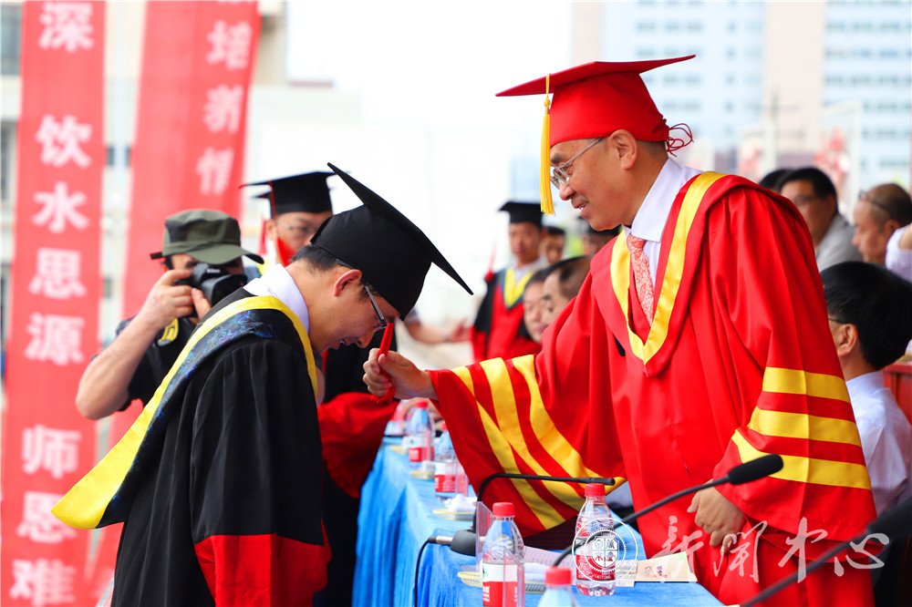 仪式最后,伴随着欢快的乐曲,校长、学位评定委员会主席李引珍教授为2018届毕业的博士研究生、硕士研究生代表正冠拨苏、颁发学位证书;出席典礼的领导及嘉宾为2018届本科毕业生颁发了毕业证书和学位证书,为2018届优秀毕业生颁发荣誉证书。