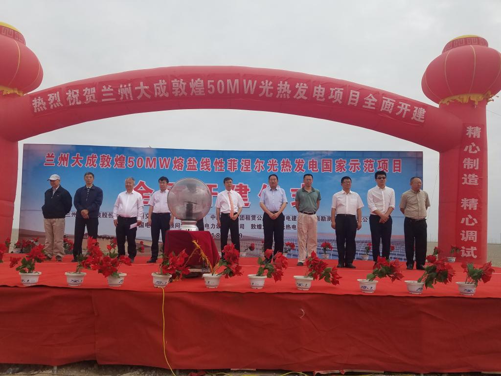 敦煌50MW光热发电示范项目为首批20个光热发电国家示范项目之一,采用由我校范多旺教授科研团队研发的熔盐线性菲涅尔式集热技术,由我校参股企业兰州大成科技股份有限公司投资建设。项目于2017年正式开工,已完成项目初步设计评审、主要设备招标工作,现场已进行部分集热场工程建设工作。本次全面开建仪式标志着项目正式进入大规模施工阶段。