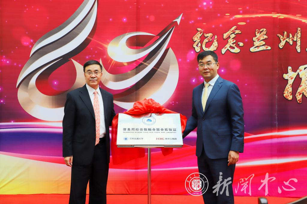 李引珍校长向新华三技术有限公司和兰州微宝宝有限公司颁发捐赠证书,并与新华三集团副总裁张浩,兰州微宝宝有限公司总经理马卫东分别为“信息网络云数融合联合实验室”、“云计算与大数据应用研究中心”揭牌。