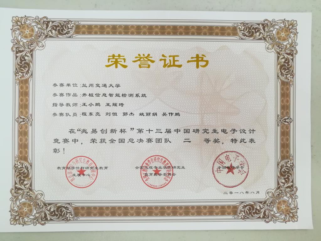近期,第十三届中国研究生电子设计竞赛全国总决赛在南京工业大学举行,由我校电子与信息工程学院选派的“井桩信息智能检测系统”荣获团队二等奖,创造了我校在该项赛事上的最好成绩。