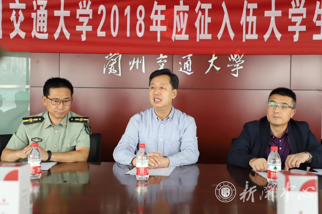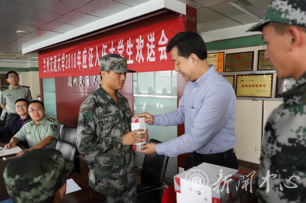 9月9日下午,兰州交通大学2018年新兵入伍欢送会在教育科技中心6楼会议室举行。副校长马军党代表学校党委、行政及全体师生向积极应征入伍的新兵表示祝贺,为入伍新兵佩戴红花,发放纪念品,送上最诚挚的祝福。会议由学生工作(部)处、党委人民武装部负责人主持。